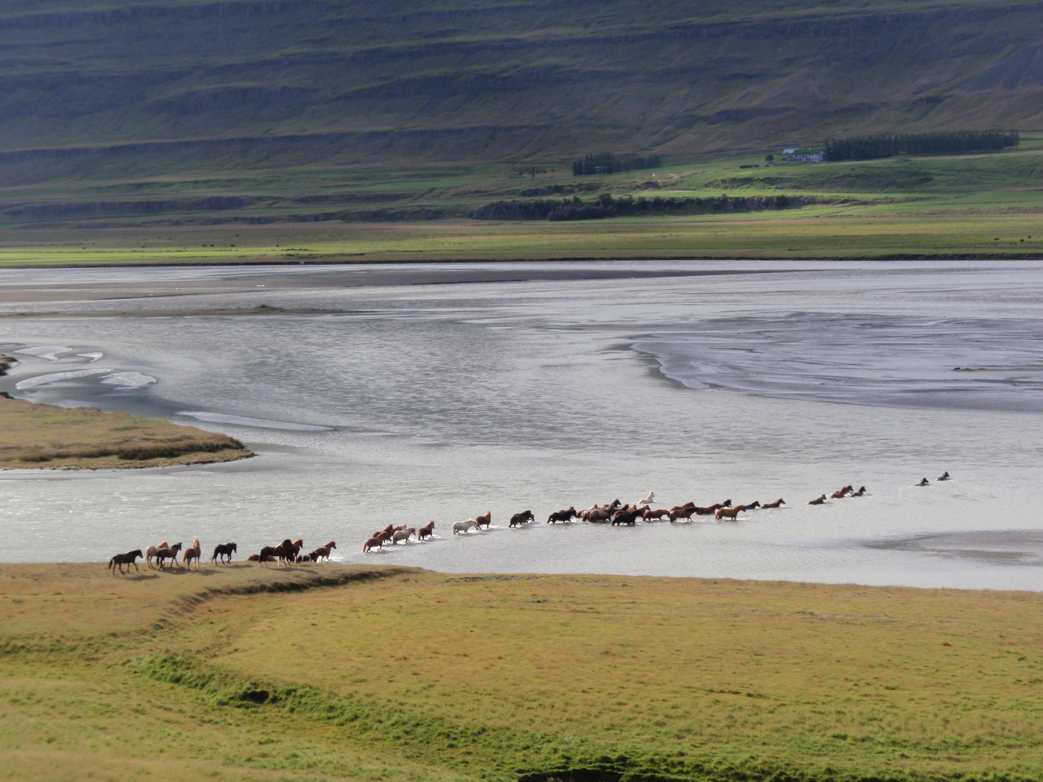one truck sometimes dropping off tents or food refills along the way. We rode a new way, further north past Jokuldal and to Saenutasel – an old turf house farm. From there we rode to Laugarvalladalur, a geothermally active valley with a hot waterfall to shower under. The third day was the most interesting, as we rode with our horses, pack horse and herd of 40 loose horses over the Kárahnjúkar dam – a narrow bridge creating the boundary wall for the controversial hydropower plant built in the middle of the highland. The next days we rode almost the same way home, but circled the base of Snæfell and rode on the other side of Norður dalur back out into Fljótsdalur. We camped our last night and celebrated our last riding day by letting all the extra horses run free, and the truck support took all our packs so no rider held a hand horse.