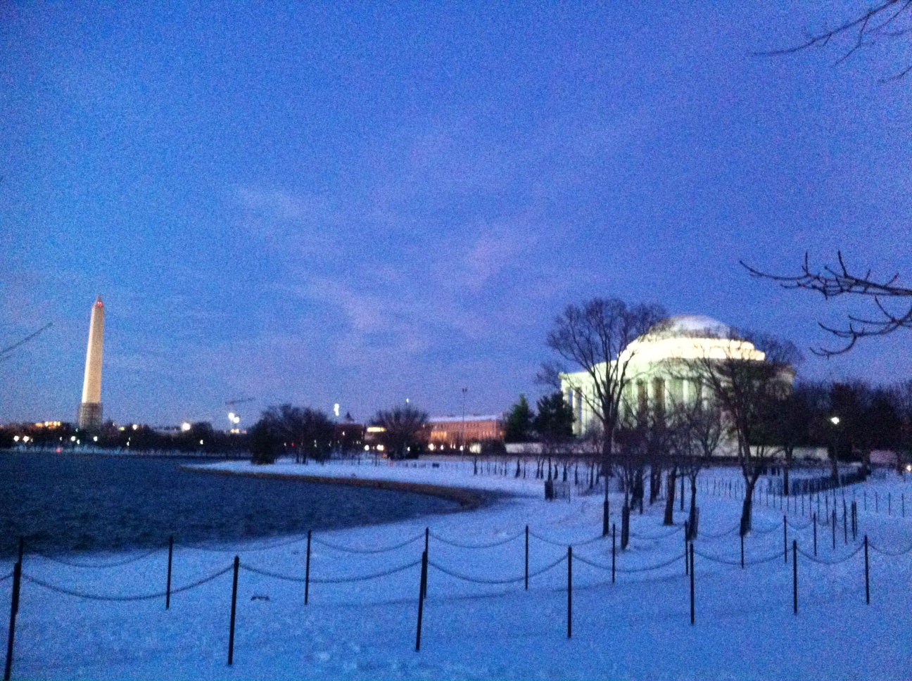 The snow came while we slept, but everything was decided hours before the first flakes of snow fell and all hell broke loose with school closures and cancelled flights. In the end, only a few centimetres fell, but without enough snow plows or winter tires, everything still shut down. The capital wash an eerie ghost town on Monday, barely a car or person in sight on the mall where we went to check out all the major monuments. We saw Abraham Lincoln, the new MLK memorial, the Washington Monument, Capitol Hill, the White House, and finally the Jefferson memorial where our only company was a stray (or rabid) fox.