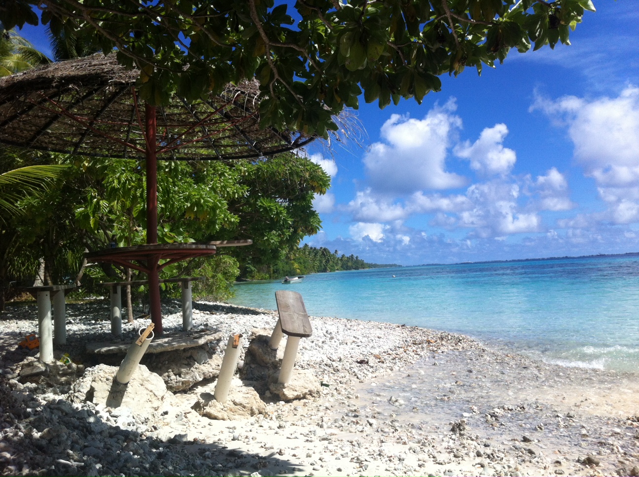 Aaaanyway, enough ranting… I loved Majuro atoll, the friendly, happy, bomb-free, locally inhabited part of the Marshall Islands. It’s a huge, broken up, u-shaped connection of atolls and islands, little spits of sand and coral sticking out of the sea, and traditional canoes sail alongside the fishing boats and private yachts in the space between them. I went to Eneko for a night, reachable from the capital city in about 15 minutes by speedboat. There me and a friend had the island to ourselves for $45 a night, including our private beach, some kayaks, a coral reef to snorkel, our wooden hut, an outdoor kitchen, the hammock and one nearly washed-away picnic table. Another night we camped at Laura beach, which isn’t a camp site but we hung a hammock and used the benches, but a drunken dumb and deaf guy came tearing through our camp a couple of times in the middle of the night, so it wasn’t quite as relaxing as Eneko.