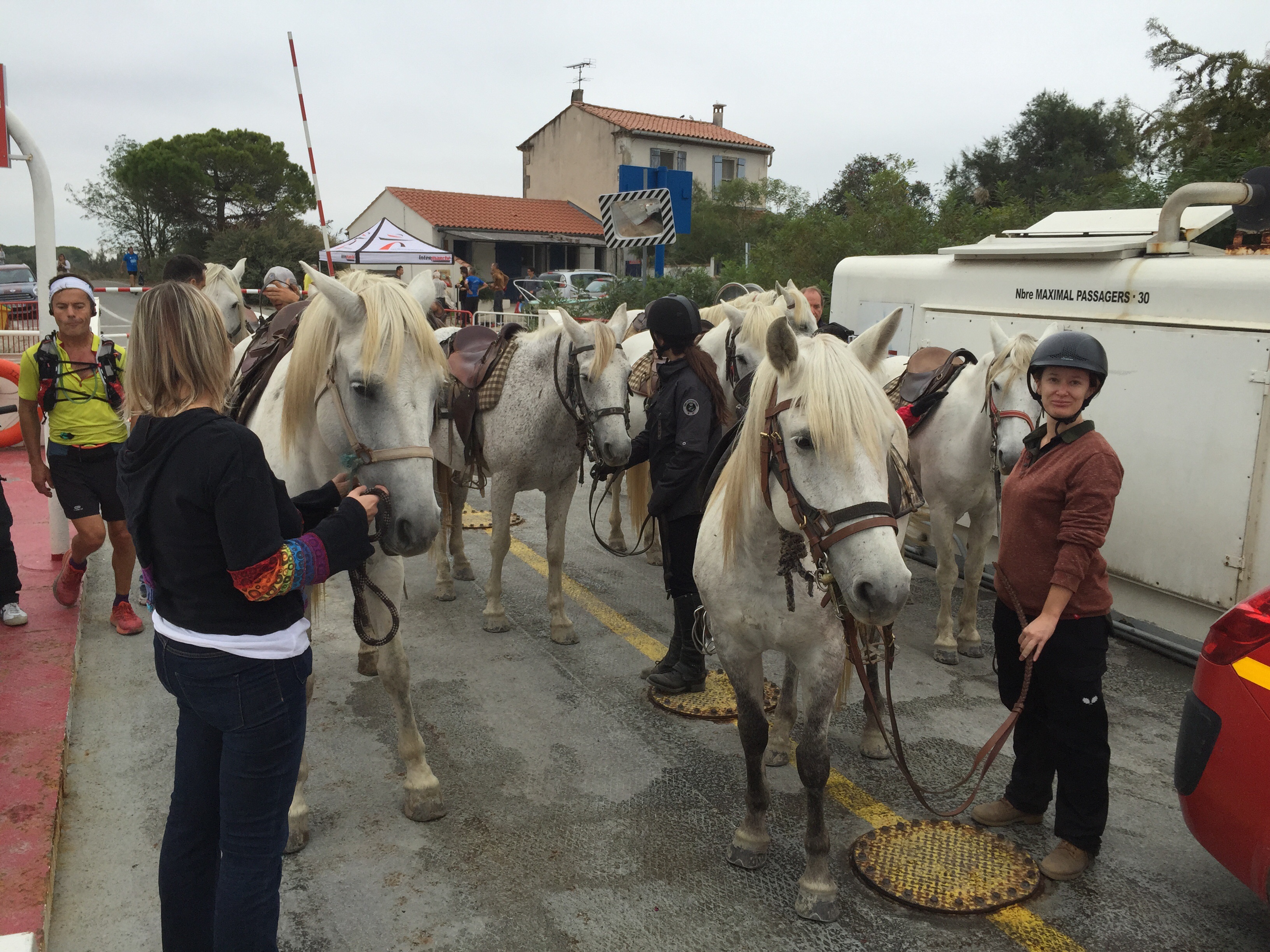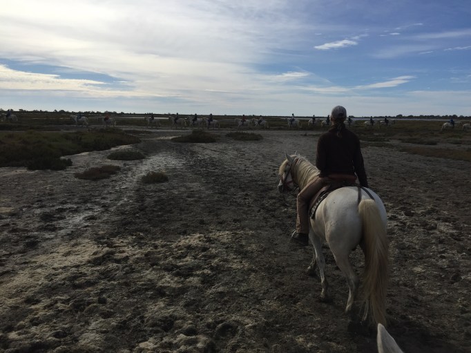 We were one group of many, and only by the end of the weekend did we realize just how many other Camargue horse farms there were in the area. One one random trail crossing in the wetlands, there were 4 groups that actually intersected, causing enough of a traffic jam that maybe yield signs or traffic lights might need to be put up there one day. We had to cross one river, an offshoot of the Rhone, on a barge, and we took our horses on board just as easily as the cars were allowed to be ferried across. Its the first, and probably the last time, I´ve ever ridden a horse on a boat.