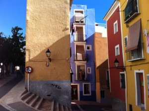 I traveled north with the local tram, an above-ground subway-like transport that can’t quite be regarded as a train. It takes you along the coast all the way to Benidorm, where I was headed, and stopped half way at Villa Joiosa. Its a colourful little walled village, also on the beach, with only sleepy dogs and old ladies to be encountered on the staired and narrow streets.