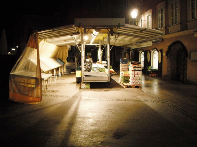 Then I was alone again, with a private Salzburg to myself, only accompanied by a cooing dove and the sound of church bells every 15 minutes. I turned into a church square at 5 am where a fruit market was just starting to be set up. 3 or 4 people slowly carried crates of ripe fruits from the truck to their stand, and didn’t even notice me watching, taking pictures.